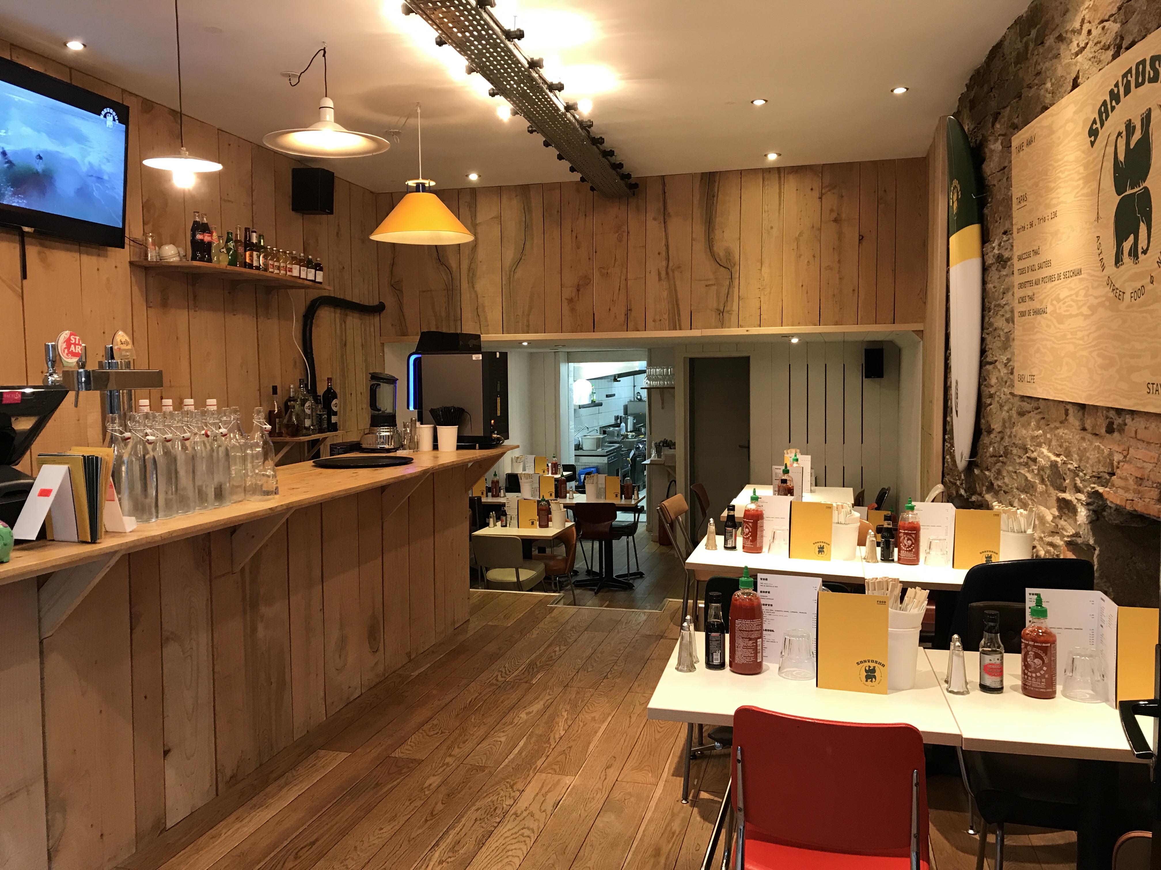 Ne vous arrêtez pas au mot “cantine”, car Santosha est un bon restaurant asiatique qui propose une carte assez diverse sans s'éparpiller. Avec un rapport qualité plus que correct, une présentation des plats un minimum soignés et une atmosphère des lieux qui est très agréable, si on doit revenir sur le mot “cantine”, je veux bien manger dans des cantines comme ça tous les jours.