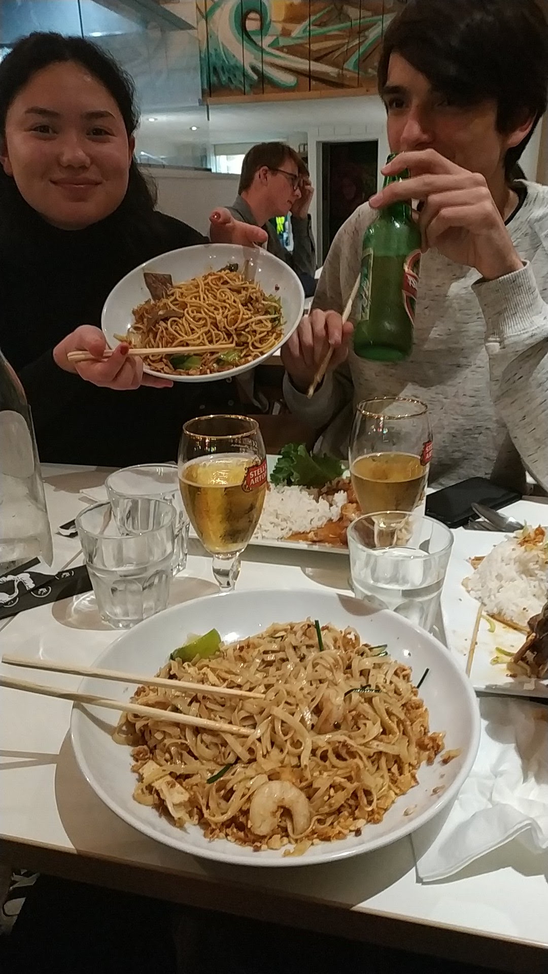 Une ambiance très agréable en salle, bien plus chaleureuse que l'extérieur du restaurant je trouve. Nous avons dîné et avons beaucoup apprécié nos plats. J'ai testé le Laska Noodle Soup et mon copain le Nua Thaï. Mon plat était bon, avec un peu trop de tofu à mon goût et pas très relevé. De la sauce pimentée est à disposition pour épicer davantage. Le plat de mon copain était à tomber, je prendrai celui-ci si nous y retournons. Je n'aime pas spécialement l'ambiance fast food des tables qui n'est pas en accord selon moi avec la cuisine et les tarifs. Les plats ne sont pas épicés comme en Thaïlande mais cela permet à chacun d'ajouter à son goût. L'accueil était chaleureux et le service impeccable, une belle découverte.