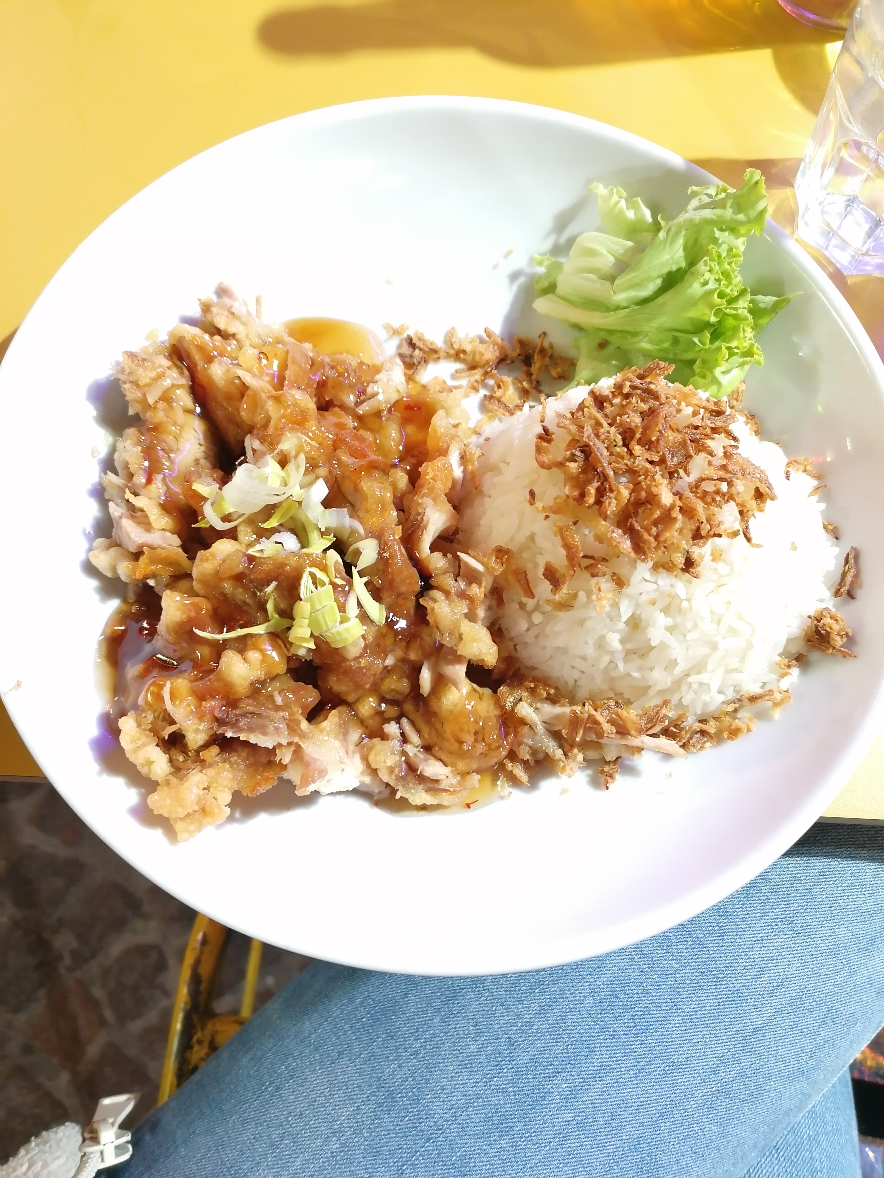 Bon rapport qualité prix, sympa, mais des legumes ne seraient pas de trop avec le poulet croustillant